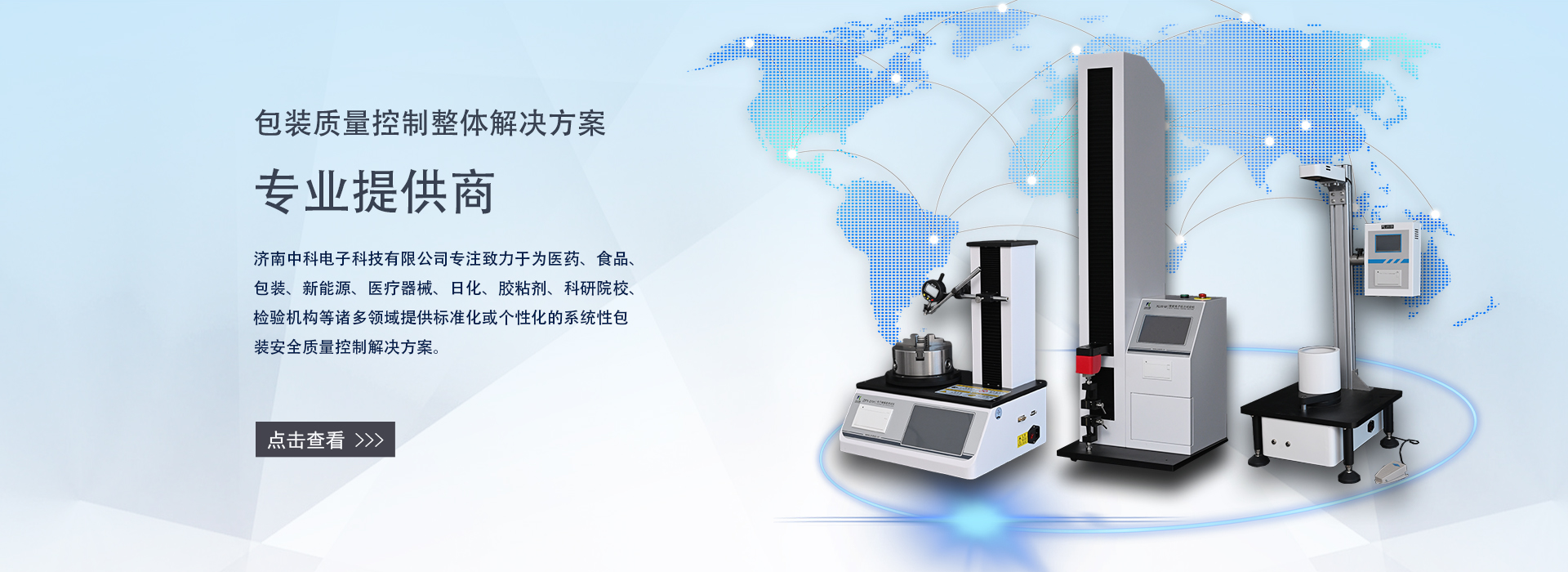 濟南中科電子科技有限公司是一家集包裝及膜材檢測儀器的研發(fā)、制造、銷售和服務為一體的專業(yè)科技公司。專注致力于為食品、醫(yī)藥、包裝、新能源、醫(yī)療器械、石化、日化、膠粘劑、科研院校、檢驗機構等諸多領域提供標準化或個性化的系統(tǒng)性包裝及膜材質量控制解決方案。